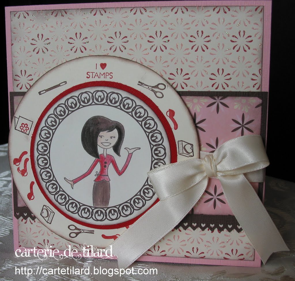 Seul le papier et l'embellissement qui entoure "Tess" ne sont plus disponible. Le jeu d'estampes est Tote-ally Tess(117076 en bois ou 118595 clair). Les encres sont Pépite de chocolat et Rouge-rouge et le ruban de satin Très vanille(117291). Dans cette série il y a tellement de choix de couleurs, wow!!! Et vous pouvez, si vous êtes intéressés, acheter quelques mètres de chacune des 13 couleurs.